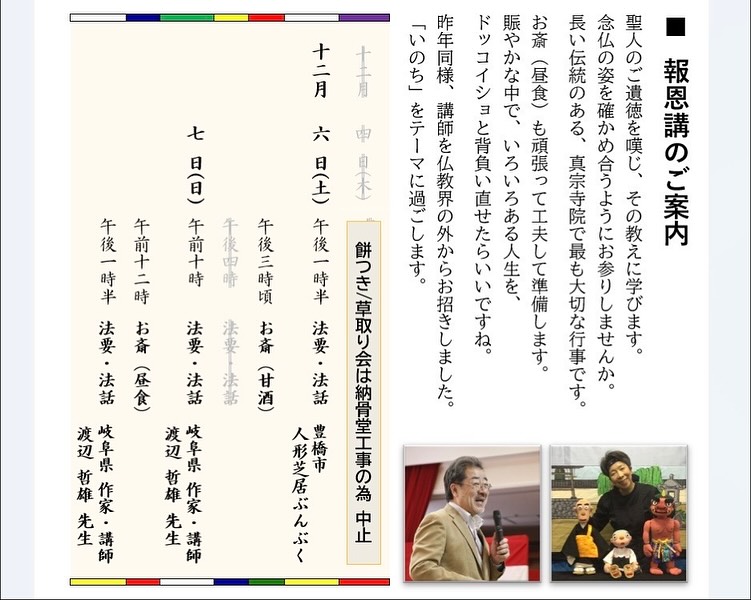 人形芝居ぶんぶく様「人情噺・ラーメン屋」 — 共感の中に涙が溢れるでしょう。渡邉哲雄先生 福祉の現場をご経験の先生が、「いのち・生き方」について、 ユーモアを交えてお話しくださいます。